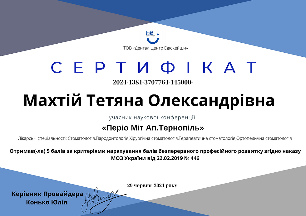 Тетяна Олександрівна працює в клініці з 2015 року та має значний досвід у сфері сучасної пародонтології. Спеціалізується на нехірургічному та хірургічному лікуванні, профілактиці захворювань ясен, володіє сучасними методиками реабілітації та відновлення тканин пародонту. Займається закриттям рецесій ясен різними методами незалежно від ступеня їх складності.